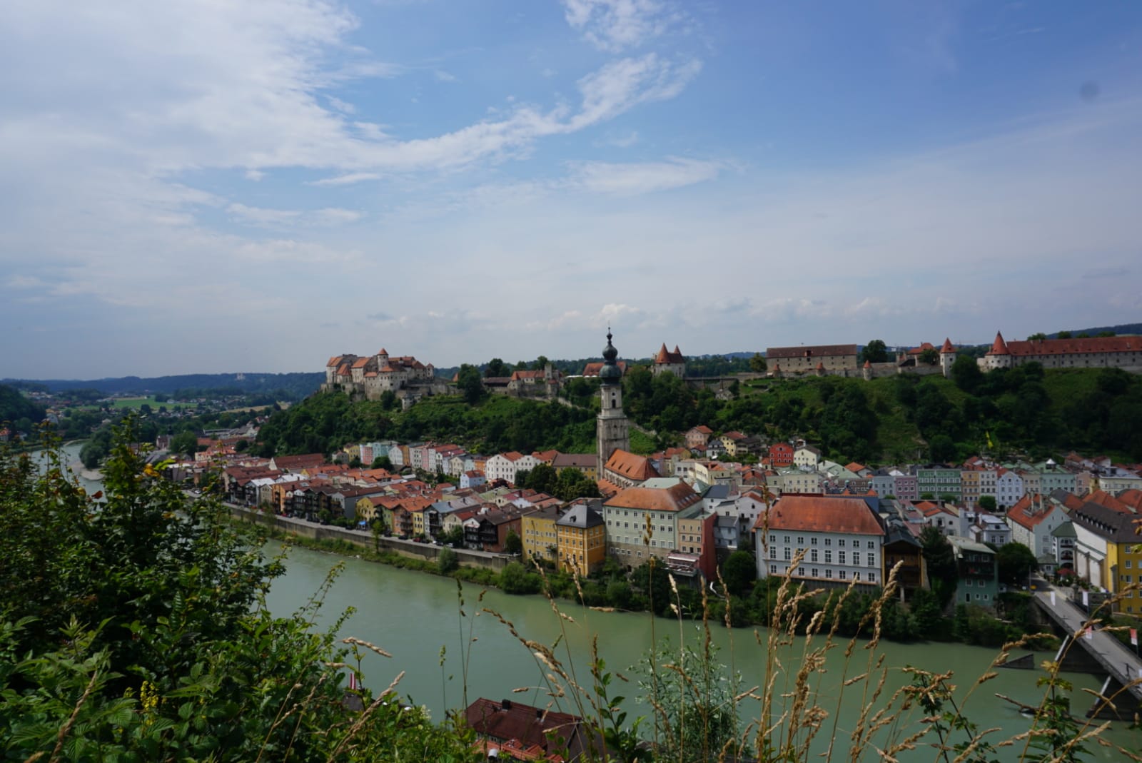 The best view of Burghausen Castle is from the Austrian side of the Salzach River. This spot is easy to find if you search for “viewpoint Burghausen” on Google Maps. You park your car near a playground and then walk to a viewpoint marked with a large painting frame.