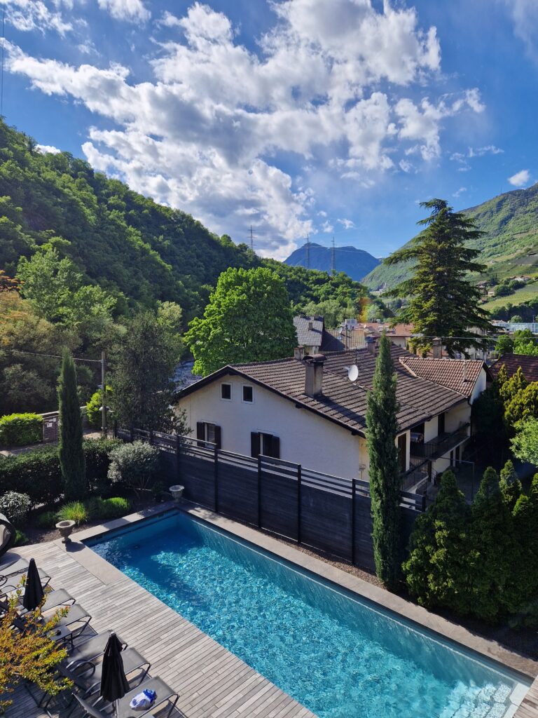 We stayed at hotel Eggentaler for a couple of nights. This is a highly recommended place to go with your dog. The hotel has a swimming pool and hot tub and is beautifully situated among the mountains (see the picture above).