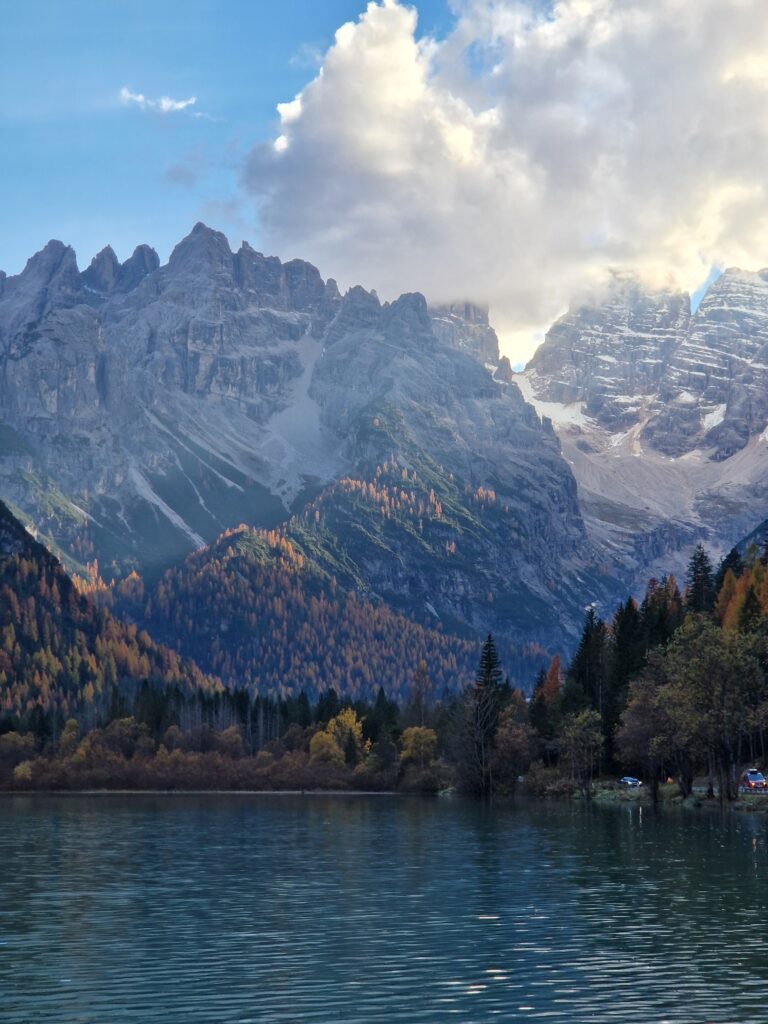 If your dog likes swimming, you can stop at Lago di Landro. This lake also features the beautiful emerald blue colour and, especially in autumn, the trees colour very nicely by the lake.